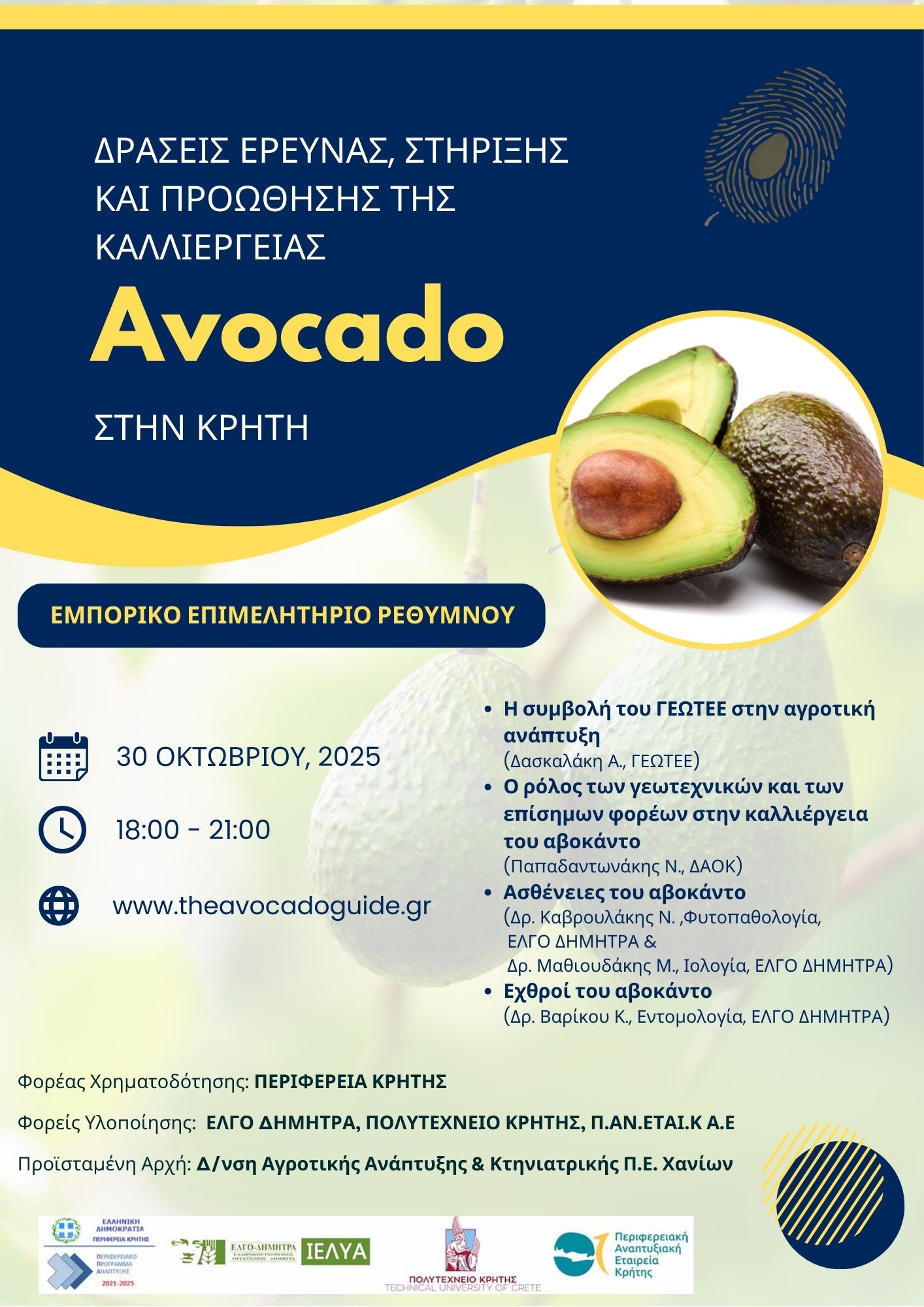 Πρόσκληση συμμετοχής καλλιεργητών και γεωτεχνικών σε σειρά εκπαιδευτικών ημερίδων απευθύνει η Περιφέρεια Κρήτης και η Περιφερειακή Αναπτυξιακή Εταιρεία Κρήτης ΑΕ ως Φορέας Υλοποίησης του ερευνητικού έργου με τίτλο «Δράσεις Έρευνας, στήριξης και προώθησης της καλλιέργειας του AVOCADO στην Κρήτη» στα πλαίσια του Προγράμματος Δράσης της Περιφέρειας Κρήτης, Άξονα Προτεραιότητας 5.11 «Προώθηση ελληνικών προϊόντων στο εξωτερικό (συμμετοχή σε εκθέσεις, εμπορικές αποστολές κλπ.)». Το έργο είναι προϋπολογισμού 300.000,00 € (με ΦΠΑ 24%) και έχει ως εμπλεκόμενους φορείς την Περιφέρεια Κρήτης, τον Ελληνικό Γεωργικό Οργανισμό ΕΛΓΟ – ΔΗΜΗΤΡΑ, το Πολυτεχνείο Κρήτης και την Περιφερειακή Αναπτυξιακή Εταιρεία Κρήτης ΑΕ με Προϊσταμένη Αρχή την Δ/νση Αγροτικής Ανάπτυξης και Κτηνιατρικής της Π.Ε. Χανίων.